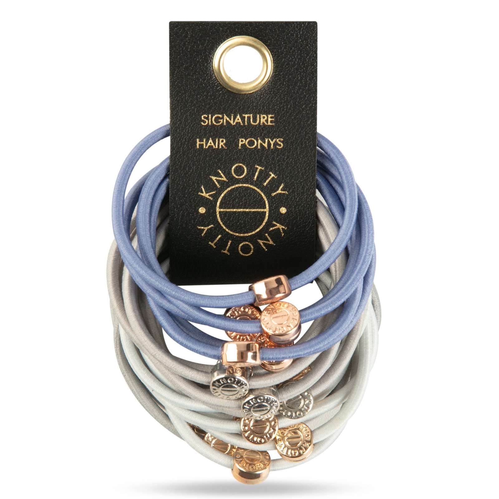Set of 20 luxury hair elastics packaged on a leather loop with gold metal grommet accent. Gold, rose gold, & rhodium gleaming metal signature accents mixed with playful colors makes the Signature Pony a classic Knotty favorite. Can be worn as a hair pony or a bracelet!